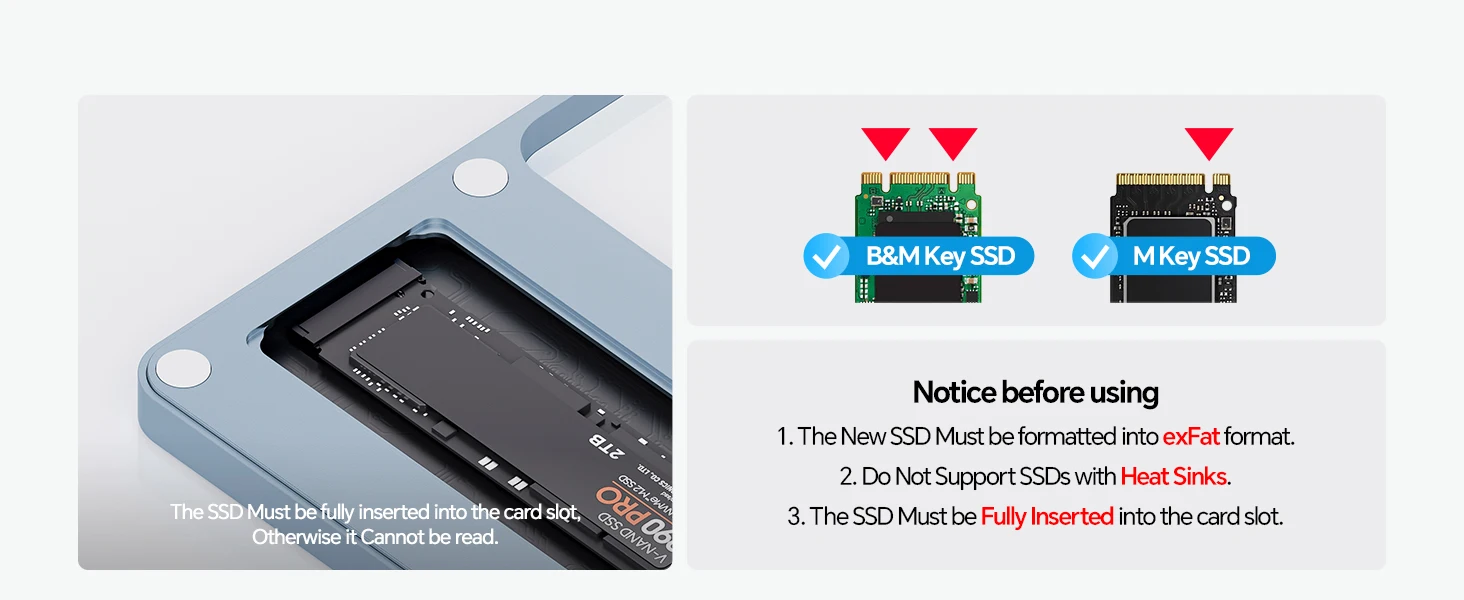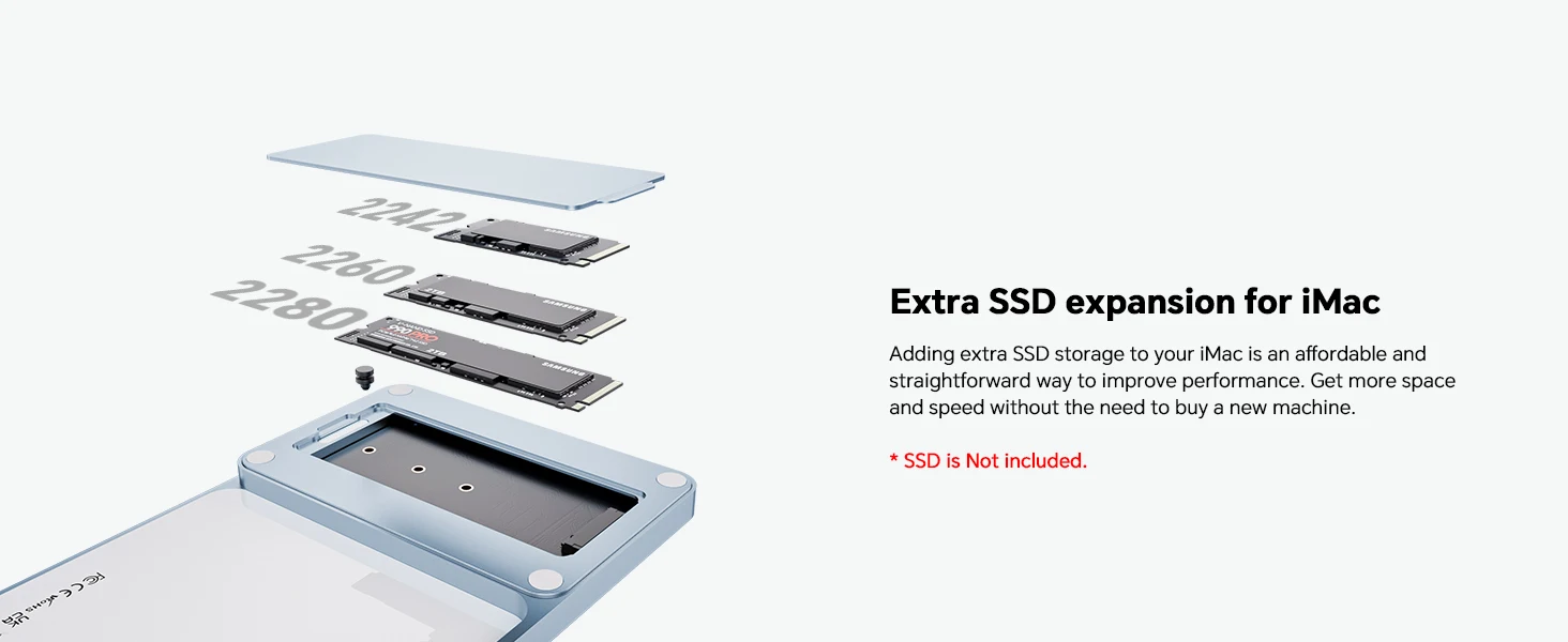 Equipped with an external hard drive slot at the bottom, this imac m4 docking station supports up to 2TB/10Gbps M.2 NVMe PCIe or SATA SSD in size of 2242/ 2260/ 2280 (SSD NOT included). An ideal imac usb dock for the 2021 2023 2024 imac 24 inch users who needs additional storage. ★NOTE: 1) DO NOT support SSDs with a heatsink. 2) Please initialize the new SSD because SSDs must be formatted to work with host in order for SSD to mount and show up