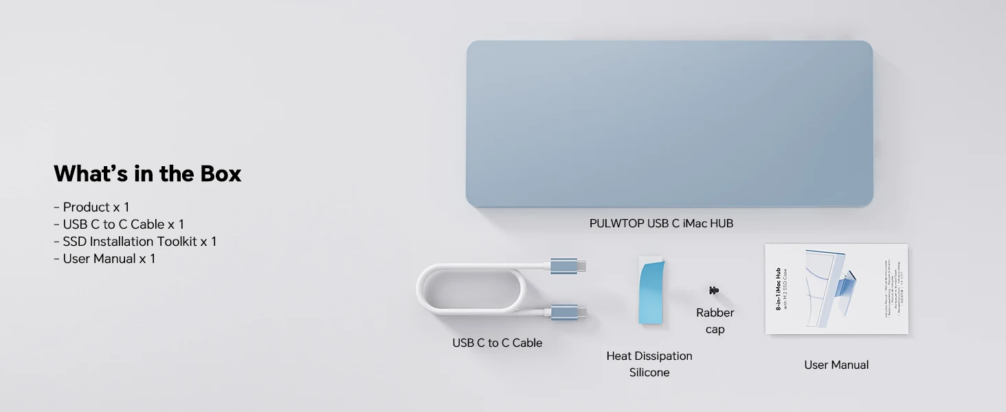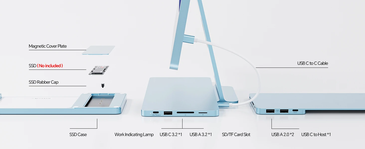 Exclusively-designed for iMac 24 inch 2021/2023/2024. As a functional imac 24 inch accessories, this imac hub features a USB-C port to connect iMac (up to 10 Gbps), M.2 NMVe SSD enclosure to add extra memory up to 2TB (SSD card NOT included), USB C 3.2 Gen2 10Gbps, USB A 3.2 Gen2 10Gbps, 2 x USB A 2.0, SD/TF card reader slots to extend your USB ports for data transfer and easy access to peripherals